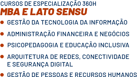 Educação, Educação Ambiental, Educação Infantil, Estudos da Religião, Finanças, Gestão, Marketing, Saúde, Administração, contabilidade, Administração Pública, Recursos Humanos, Pedagogia, Logística e Tecnologia.